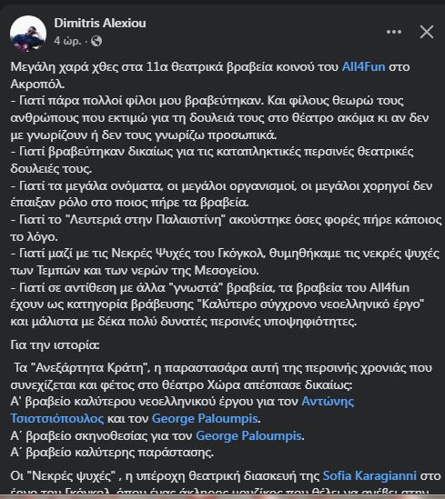 11α Θεατρικά Βραβεία Κοινού All4fun – Οι νικητές και τα όσα συνέβησαν στη βραδιά – γιορτή του ελληνικού θεάτρου