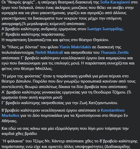 Oι νικητές και φέτος προέκυψαν από την ψηφοφορία του κοινού μας και οι τελικές υποψηφιότητες είχαν διαμορφωθεί ως εξής: https://all4fun.gr/all4fun/all4fun-all4fun/86115-11a-theatrika-vraveia-all4fun-ipopsifiotites-theatro-akropol