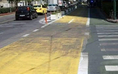 Τις τελευταίες ώρες έχει γίνει viral στα social media μια φωτογραφία από τον ποδηλατόδρομο της οδού Πανεπιστημίου, στη συμβολή με την οδό Ιπποκράτους. Σε εκείνο ακριβώς το σημείο το κίτρινο χρώμα με το οποίο έχει βαφτεί ο δρόμος, προκειμένου να καθοριστούν τα όρια του ποδηλατόδρομου, έχει ξεβάψει για τα καλά, αφού από εκεί περνά καθημερινά ένας μεγάλος αριθμός αυτοκινήτων.