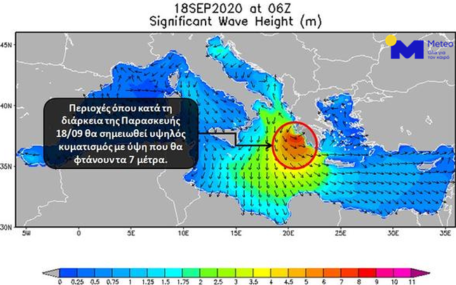 Σύμφωνα με τα προγνωστικά στοιχεία του Εθνικού Αστεροσκοπείου Αθηνών / Meteo.gr, κατά τη διάρκεια της Παρασκευής 18/09/2020, ο Μεσογειακός Κυκλώνας ΙΑΝΟΣ θα επηρεάσει τα νησιά του Κεντρικού Ιονίου και παράκτια τμήμα της Δ. Ελλάδας με κύματα το ύψος των οποίων θα φτάνει τα 7 μέτρα, όπως φαίνεται στον προγνωστικό χάρτη κυματισμού που ακολουθεί.