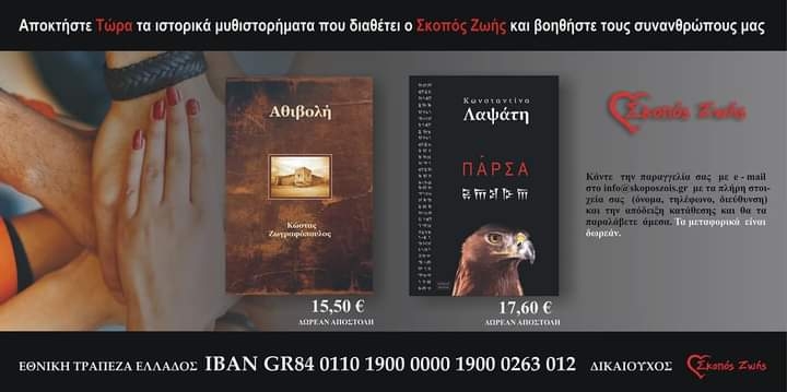 Η περιπέτεια της Ελλάδας κατά την απελευθέρωση της Κρήτης τον 19ο αιώνα, του Κώστα Ζωγραφόπουλου που υπογράφει το 423ών σελίδων βιβλίο “Αθιβολή” (συνημμένο απόσπασμα βιβλίου), καθώς και οι σχέσεις της Ελλάδας με την Περσική αυτοκρατορία του Αρταξέρξη των 671 σελίδων συγγραφικού έπους που τιτλοφορείται “Πάρσα” της Κωνσταντίνας Λαψάτη (συνημμένο απόσπασμα βιβλίου), θα διατίθενται πλέον από αυτές τις γιορτές των Χριστουγέννων μέσω του οργανισμού Σκοπός Ζωής.