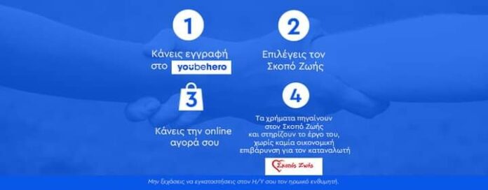 Το μόνο που χρειάζεται να κάνεις είναι να συμπληρώσεις τα στοιχεία σου στη φόρμα εγγραφής του YouBe Hero (https://www.youbehero.com/gr) και να εγκαταστήσεις στον υπολογιστή σου τον ηρωικό ενθυμητή (www.youbehero.com/gr/plugin). Αν χρειάζεσαι επιπλέον βοήθεια παρακολούθησε τα παρακάτω βίντεο για το πώς γίνεται η διαδικασία εγραφής-δωρεάς (https://youtu.be/YsFopfgIrOQ) και για το πώς μπορείς να εγκαταστήσεις τον ηρωικό ενθυμητή (https://youtu.be/NiIpWxHAgJM) για τις online αγορές σου! Στη συνέχεια κάθε φορά που θα κάνεις online αγορές από συνεργαζόμενες με το YouBe Hero επιχειρήσεις (Public, Brands Galaxy, Aliexpress, Factory outlet, Celestino, Dominos, AB Βασιλόπουλος, ΙΑΝΟΣ, Aegean, Media Markt, Μουστάκας, Sugar Free, CosmosSport, Fullah Sugah, Attica, ebay, Tsakiris Mallas, Sephora, The Body Shop, Gallery d’Beaute κ.ά.), ο ηρωικός ενθυμητής θα σου θυμίζει ότι μπορείς να προφέρεις παράλληλα χωρίς να σου κοστίσει. Επιλέγεις στις οργανώσεις που θέλεις να στηρίξεις τον «Σκοπό Ζωής» (https://skoposzois.gr) και υποστηρίζεις τους στόχους του. Διάδωσέ το σε φίλους και γνωστούς προκειμένου να στηρίξεις το έργο μας μέσα από τις online αγορές σου. Δε σου κοστίζει τίποτα κι όμως προσφέρεις.