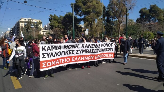 Σήμερα πραγματοποιήθηκε μία ακόμα συγκέντρωση των εργαζομένων του χώρου του Πολιτισμού στο Υπουργείο Πολιτισμού και στη συνέχεια πορεία προς το Υπουργείο Εργασίας. Η μαζικότητα και ο παλμός της κινητοποίησης απέδειξε την αμείωτη αγωνιστικότητα των ανθρώπων του Πολιτισμού, που εδώ και ένα χρόνο διεκδικούν το νόμιμο δικαίωμά τους για στήριξη ενός κλάδου που έχει πληγεί όσο κανείς από την πανδημία.