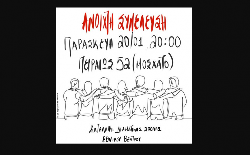 Το συντονιστικό της κατάληψης της Ανωτέρας Σχολής Δραματικής Τέχνης του Εθνικού Θεάτρου καλεί τους σπουδαστές και τις σπουδάστριες όλων των δραματικών σχολών, καλλιτέχνες, καθώς και όλα τα αλληλέγγυα στον αγώνα μας άτομα την Παρασκευή 20/1 και ώρα 20:00 στο Σχολείον της Ειρήνης Παπά (Πειραιώς 52, Μοσχάτο), με σκοπό τον διάλογο, την συσπείρωση των δυνάμεων μας και την χάραξη ενός σχεδίου δράσεων από εδώ και πέρα.