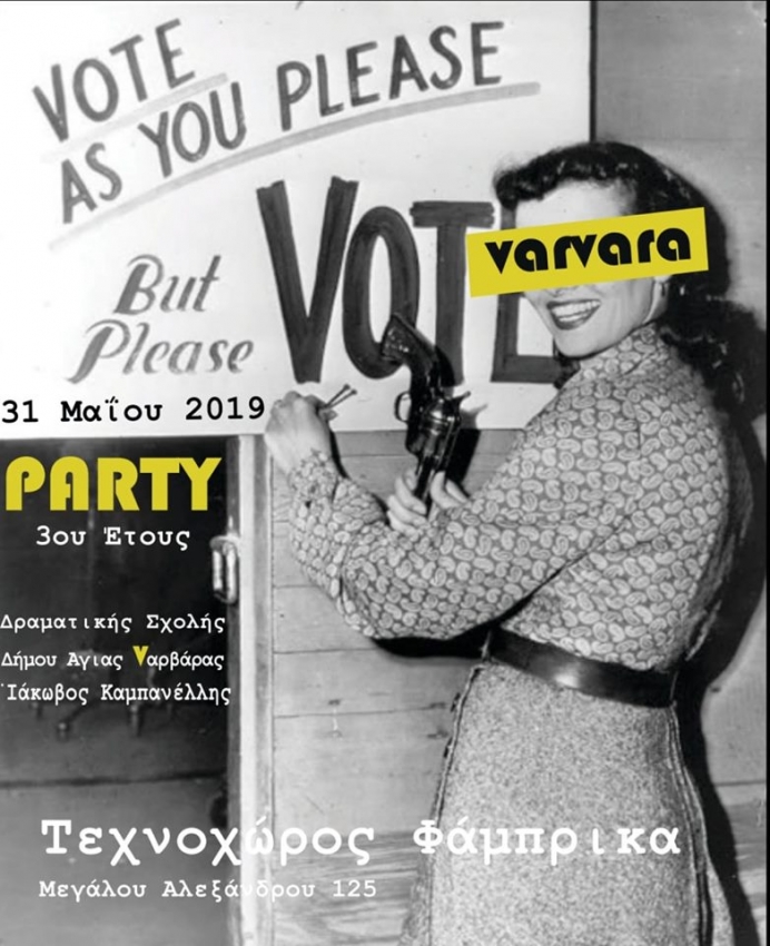 Το 3ο Έτος της Ανώτερης Σχολής Δραματικής Τέχνης Δήμου Αγίας Βαρβάρας ” Ιάκωβος Καμπανέλλης” σας προσκαλεί στο PARTY που διοργανώνει για την οικονομική ενίσχυση των διπλωματικών του εξετασεων.