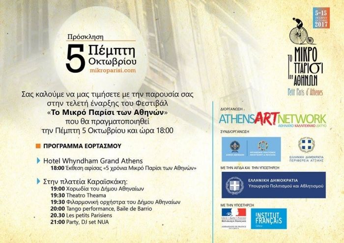 Την Πέμπτη 5 Οκτωβρίου στις 18:00 το “Μικρό Παρίσι των Αθηνών” ξεκινά τις καλλιτεχνικές δράσεις του για το 2017. Δέκα μέρες γεμάτες θέατρο,μουσική, δράσεις δρόμου, εικαστικές εκθέσεις και διαλέξεις, παιχνίδια κι εκπαιδευτικά προγράμματα.