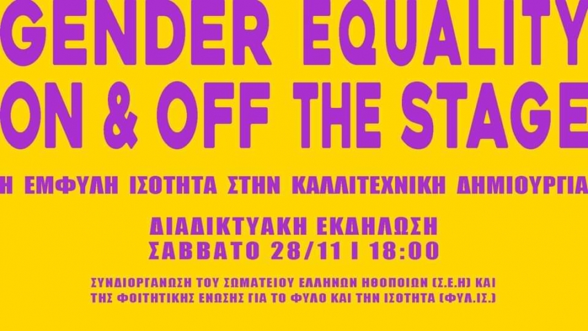 Το Σωματείο Ελλήνων Ηθοποιών (Σ.Ε.Η.) και η Φοιτητική Ένωση για το Φύλο και την Ισότητα (ΦΥΛ.ΙΣ.) σας προσκαλούν στην διαδικτυακή τους εκδήλωση «Gender Equality On and Off the Stage: Η Έμφυλη Ισότητα στην Καλλιτεχνική Δημιουργία», που θα πραγματοποιηθεί το Σάββατο 28 Νοεμβρίου 2020 και ώρα 18:00, μέσω Zoom.