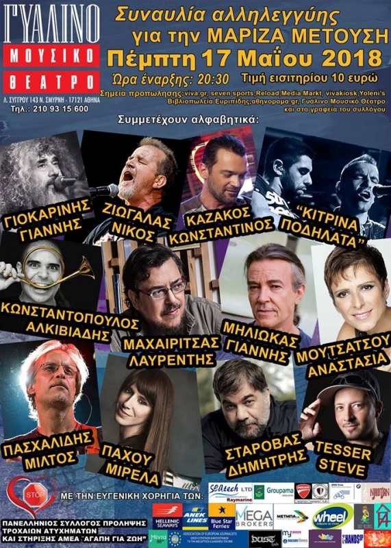 Ο Πανελλήνιος Σύλλογος Πρόληψης Τροχαίων Ατυχημάτων & Στήριξης ΑΜΕΑ, Αγάπη για Ζωή, διοργανώνει την Πέμπτη 17 Μαΐου 2018 και ώρα 20:30 στο Γυάλινο Μουσικό Θέατρο (Λεωφ. Συγγρού 143, Νέα Σμύρνη), μουσική εκδήλωση για τη στήριξη της αθλήτριας Μαρίζας Μετούση, η οποία μετά από αθλητικό ατύχημα καθηλώθηκε σε αμαξίδιο. Τα έσοδα της εκδήλωσης θα διατεθούν, ώστε να αγοραστεί το ειδικού τύπου αμαξίδιο της Μαρίζας.