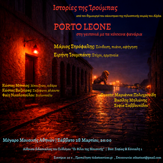 Μια βραδιά γεμάτη από τον μουσικό ήχο της σειράς “Porto Leone” που έντυσε τα πάθη, τους έρωτες και τις σκιές του λιμανιού, μέσα από τις νότες του Μάριου Στρόφαλη και τους στίχους της Ειρήνης Τουμπάκη, μαζί με αληθινές ιστορίες της Τρούμπας.