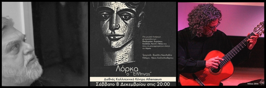 Στις 8 Δεκεμβρίου στο Athenaeum, ο σκηνοθέτης Βασίλης Νικολαΐδης στο τραγούδι και ο Νίκος Χατζηελευθερίου στην κιθάρα, μας παρουσιάζουν μια διαδρομή στο μελοποιημένο από Έλληνες συνθέτες έργο του Φεντερίκο Γκαρσία Λόρκα. Τα περισσότερα ποιήματα του έχουν αποδοθεί για κιθάρα και φωνή, το παραδοσιακό όργανο έκφρασης της Ανδαλουσίας. Ο Λόρκα, ο αβαντ-γκαρντ ποιητής της «γενιάς του 27» ή αλλιώς της «Αργυρής Εποχής» της ισπανικής λογοτεχνίας είναι ένας από τους πιο αγαπητούς ποιητές στη χώρα μας και ως εκ τούτου έχει μελοποιηθεί από σειρά καταξιωμένων συνθετών. Όπως μας λέει και ο Μαμαγκάκης «σαν Μεσογειακός ποιητής, ο Λόρκα μας άρπαξε από την καρδιά και το μυαλό».