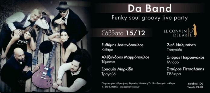 Το Σάββατο 15 Δεκεμβρίου το El Convento del Arte, θα φιλοξενήσει τους Da Band, ένα 6-μελές σχήμα upbeat μουσικών που θα φροντίσει τη διασκέδασή σας με ένα πολύ δυνατό soul-funk χορευτικό πρόγραμμα διασκευών γνωστών ακουσμάτων, με επιρροές από Bill Whithers εως Mark Ronson και από Jamiroquai μέχρι Chaka Khan