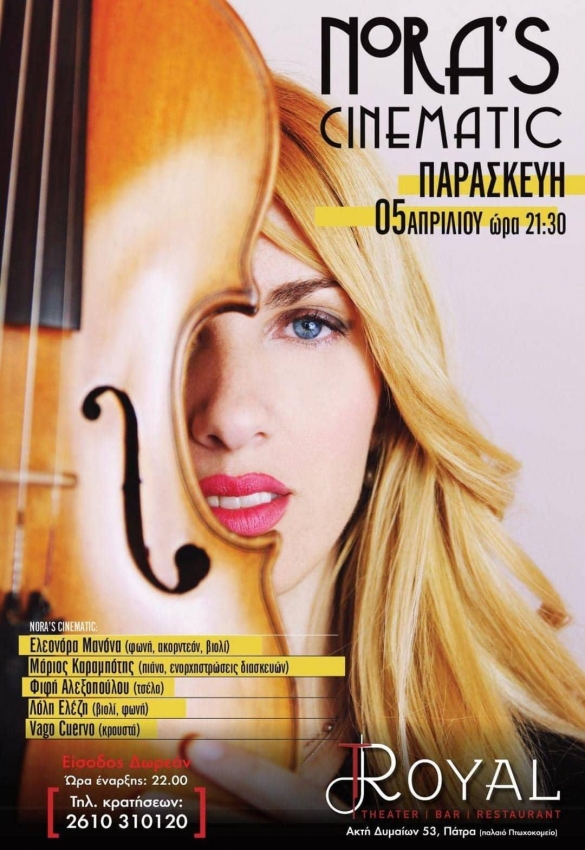 Μετά απ’τον πρώτο επιτυχημένο κύκλο εμφανίσεων στην Αθήνα, οι “Nora’s Cinematic” θα βρεθούν στο Steak Bar του ROYAL στην Πάτρα, την ιδιαίτερη πατρίδα της Ελεονόρας Μανόνα, την Παρασκευή στις 5 Απριλίου.