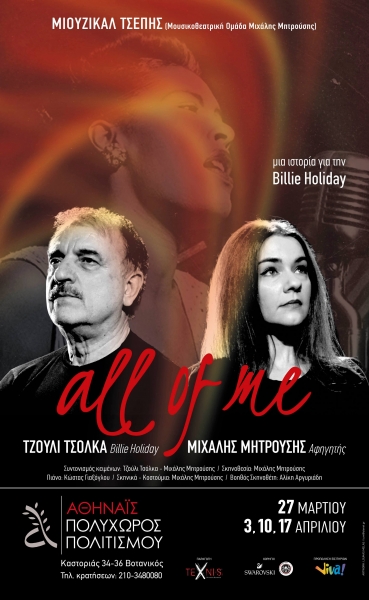 Το Μιούζικαλ Τσέπης παρουσιάζει τη μουσική παράσταση «All Of Me» στον Πολυχώρο Πολιτισμού Αθηναΐς – Μουσική Θεατρική Σκηνή, για 4 μόνο παραστάσεις, κάθε Τρίτη από τις 27 Μαρτίου μέχρι τις 17 Απριλίου. Ένα ταξίδι στη ζωή της μεγάλης τραγουδίστριας της τζαζ, Billie Holiday (Μπίλι Χόλιντεϊ).