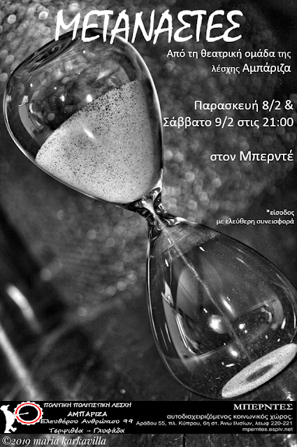 Ένα έργο, βασισμένο στο θεατρικό έργο “Μεταναααάστες ή Είμαστε πάρα πολλοί πάνω σ’ αυτήν την πουτάνα τη βάρκα” του Ματέι Βίσνιεκ, από την θεατρική ομάδα της λέσχης Αμπάριζα.