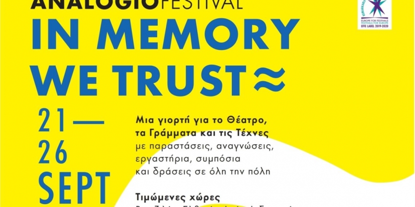 Το Διεθνές Φεστιβάλ Αναλόγιο, ένας από τους σημαντικότερους θεατρικούς θεσμούς, διοργανώνεται για 16η συνεχή χρονιά στην Αθήνα από το Σάββατο 21 έως και την Πέμπτη 26 Σεπτεμβρίου 2019, με θεματικό άξονα την Μνήμη και με μότο «In memory we trust».