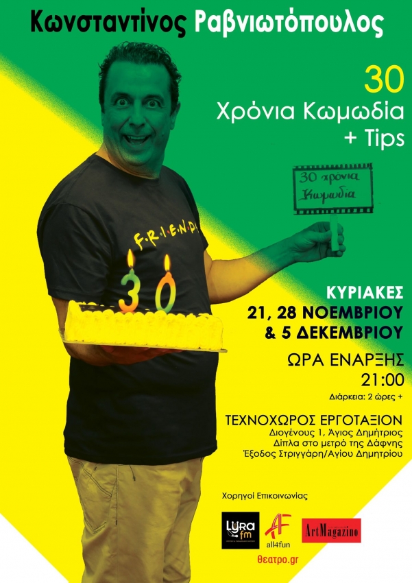 Ο δημοφιλής κωμικός, Ραβνιωτόπουλος Κωνσταντίνος, είναι ο πρώτος που ξεκίνησε να κάνει stand up comedy στην Ελλάδα και φέτος κλείνοντας τα 30 του χρόνια, το γιορτάζει δεόντως με μια απολαυστική παράσταση δίωρης + διάρκειας με τον τίτλο “30 ΧΡΟΝΙΑ ΚΩΜΩΔΙΑ + tips”.