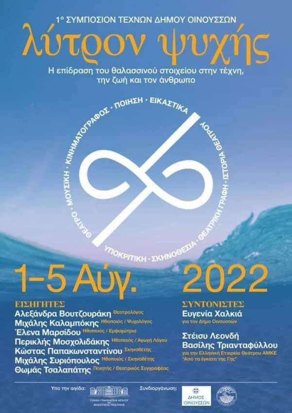 O Δήμος Οινουσσών συνεπής στην αποστολή του, την ανάδειξη του μικρού ακριτικού νησιου σε αειφόρο κέντρο πολιτιστικού ενδιαφέροντος, σε συνεργασία με την Ελληνική Εταιρεία Θεάτρου ΑΜΚΕ «Από τα Έγκατα της Γης», διοργανώνει το 1ο ΣΥΜΠΟΣΙΟ ΤΕΧΝΩΝ με θέμα: «Επίδραση του θαλασσινού στοιχείου στην τέχνη, την ζωή και τον άνθρωπο» από 1 Αυγούστου έως 5 Αυγούστου 2022. Το Συμπόσιο θα υλοποιηθεί υπό την αιγίδα της Γενικής Γραμματείας Αιγαίου και Νησιωτικής Πολιτικής.