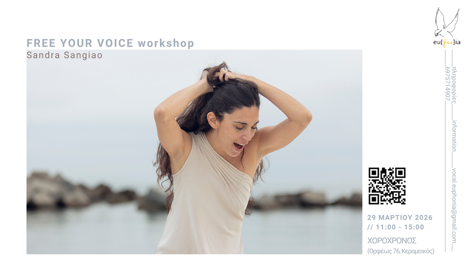 H ομάδα eu[φων]ia στα πλαίσια των εργαστηρίων της και των συνεργασιών της με καταξιωμένους καλλιτέχνες και επιστήμονες της φωνής, φέρνει για πρώτη φορά στην Ελλάδα τη διεθνούς φήμης τραγουδίστρια, performer και voice mentor Sandra Sangiao για ένα μοναδικό workshop φωνής.