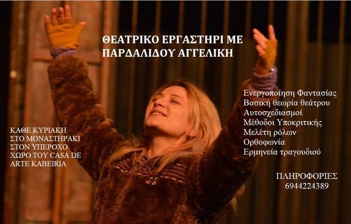 Κάθε Κυριακή σε περιμένω στον χώρο του Casa De Arte Kabeiria… να μοιραστούμε χαρά και δημιουργία…να ζήσουμε όμορφες στιγμές… να γελάσουμε… να συγκινηθούμε… να κινηθούμε… να μπούμε μαζί σε έναν μαγικό κόσμο… στον κόσμο του θεάτρου.