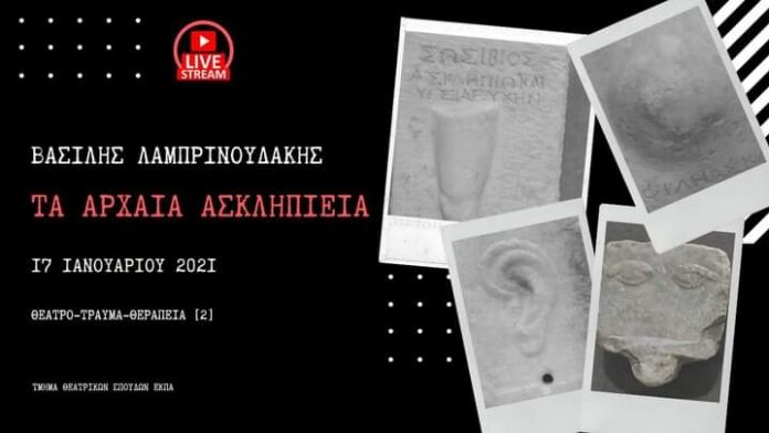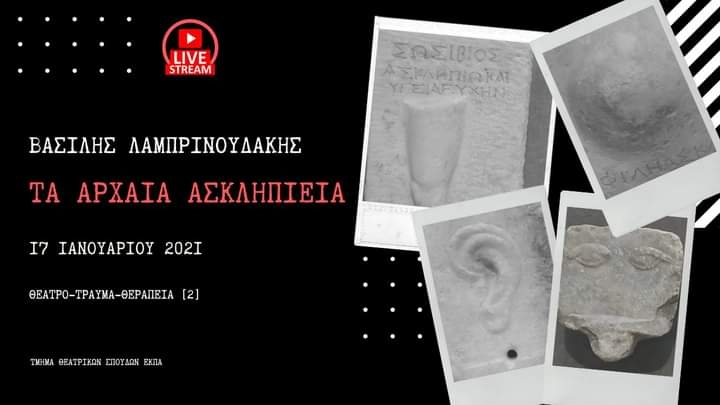«Θέατρο και θεραπεία στην αρχαία Ελλάδα. Η περίπτωση των Ασκληπιείων» ομιλία του καθηγητή Βασίλη Λαμπρινουδάκη την Κυριακή 17 Ιανουαρίου 2021 στις 12:00 μέσα από την ψηφιακή πλατφόρμα Zoom και μέσω των κοινωνικών δικτύων του Τμήματος Θεατρικών Σπουδών ΕΚΠΑ.