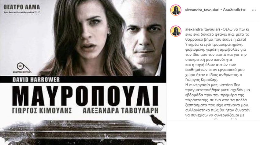 Η Αλεξάνδρα Ταβουλάρη δημοσίευσε στον προσωπικό της λογαριασμό στο instagram το γιατί είχε ακυρωθεί η παράσταση Μαυροπούλι το 2017 λίγες ημέρες μόλις πριν γίνει η πρεμιέρα.