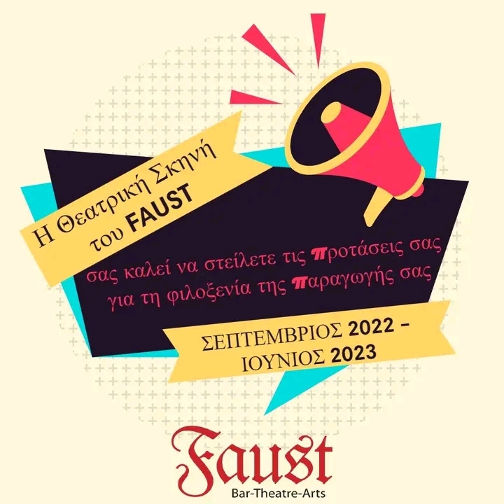 Η Θεατρική Σκηνή του FAUST σας καλεί να στείλετε τις προτάσεις σας για τη φιλοξενία της παραγωγής σας κατά την περίοδο ΣΕΠΤΕΜΒΡΙΟΣ 2022 – ΙΟΥΝΙΟΣ 2023.