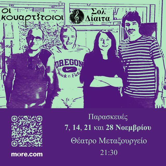 Με παχουλά λογοπαίγνια και πειρά(γ)ματα της γλώσσας, «Οι Κουαρτέτοιοι», σε μουσική τού συνθέτη Νίκου Πλατύραχου και στίχους τής ηθοποιού Τίνας Γιωτοπούλου, συνθέτουν μια σατιρική μουσική παράσταση με τίτλο «Σολ Δίαιτα», τη σκηνοθετική επιμέλεια της οποίας υπογράφει ο ηθοποιός, μουσικός και σκηνοθέτης Γιώργος Τζαβάρας. «Οι Κουαρτέτοιοι» δημιουργούν ιστορίες για όσα, καθημερινά, μας βασανίζουν και τις… σερβίρουν με χιούμορ μαριναρισμένο σε λίγη αυτοκαταστροφή και μια κουταλιά λίπους. Ακροβατούν με έναν θεατρικό τρόπο από τους έρωτες στις δίαιτες, από το tango στο ρεμπέτικο και από το swing στο… dining, δημιουργώντας ένα μεταθερμιδικό καμπαρέ.