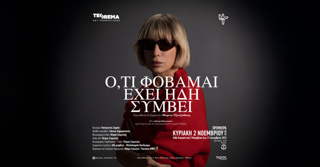 Τι γίνεται όταν το χειρότερο που μπορούμε να φανταστούμε έχει ήδη συμβεί; Η νέα site specific solo performance «Ό,τι φοβάμαι έχει ήδη συμβεί», εμπνευσμένη από το εμβληματικό The Year of Magical Thinking της Joan Didion, ανεβαίνει στη σκηνή για να φωτίσει με κοφτή ειλικρίνεια και λεπτό μαύρο χιούμορ το πιο ανθρώπινο θέμα: την απώλεια. Όπως η Didion μετατρέπει το πένθος σε αφήγηση και το σοκ σε παρατήρηση, έτσι και το “Ό,τι φοβάμαι έχει ήδη συμβεί” αναμετριέται με την εκείνη την -κατά τα άλλα- καθημερινή στιγμή που, ξαφνικά, μπορεί να μας αλλάξει για πάντα.