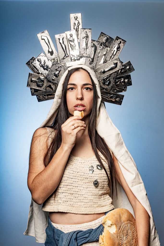 Μια νέα γυναίκα ταξιδεύει στην Τήνο κρατώντας ένα χρυσό μωρό για προσφορά.