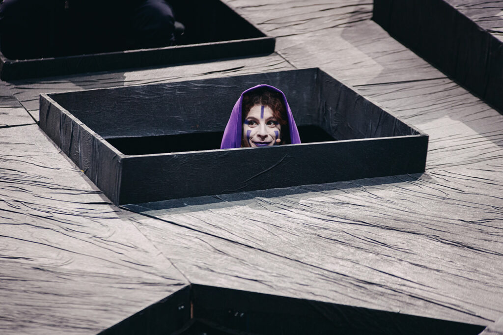Ο σκηνικός χώρος της Κατερίνας Παπαγεωργίου, η οποία υπογράφει και τα κοστούμια, παραπέμπει στο παιγνιώδες μοτίβο του παιχνιδιού «Whac-A-Mole» και σε καταφύγιο πολέμου. Τα σώματα των ηθοποιών δημιουργούν μια αίσθηση συνεχούς εμφάνισης και εξαφάνισης, εγρήγορσης, απειλής και καταστολής. Η αίσθηση ζόφου ενός χώρου εγκλεισμού ή καταφυγίου αντιπαραβάλλεται με το παιγνιώδες και ενίοτε σαρκαστικό ύφος της μουσικής.