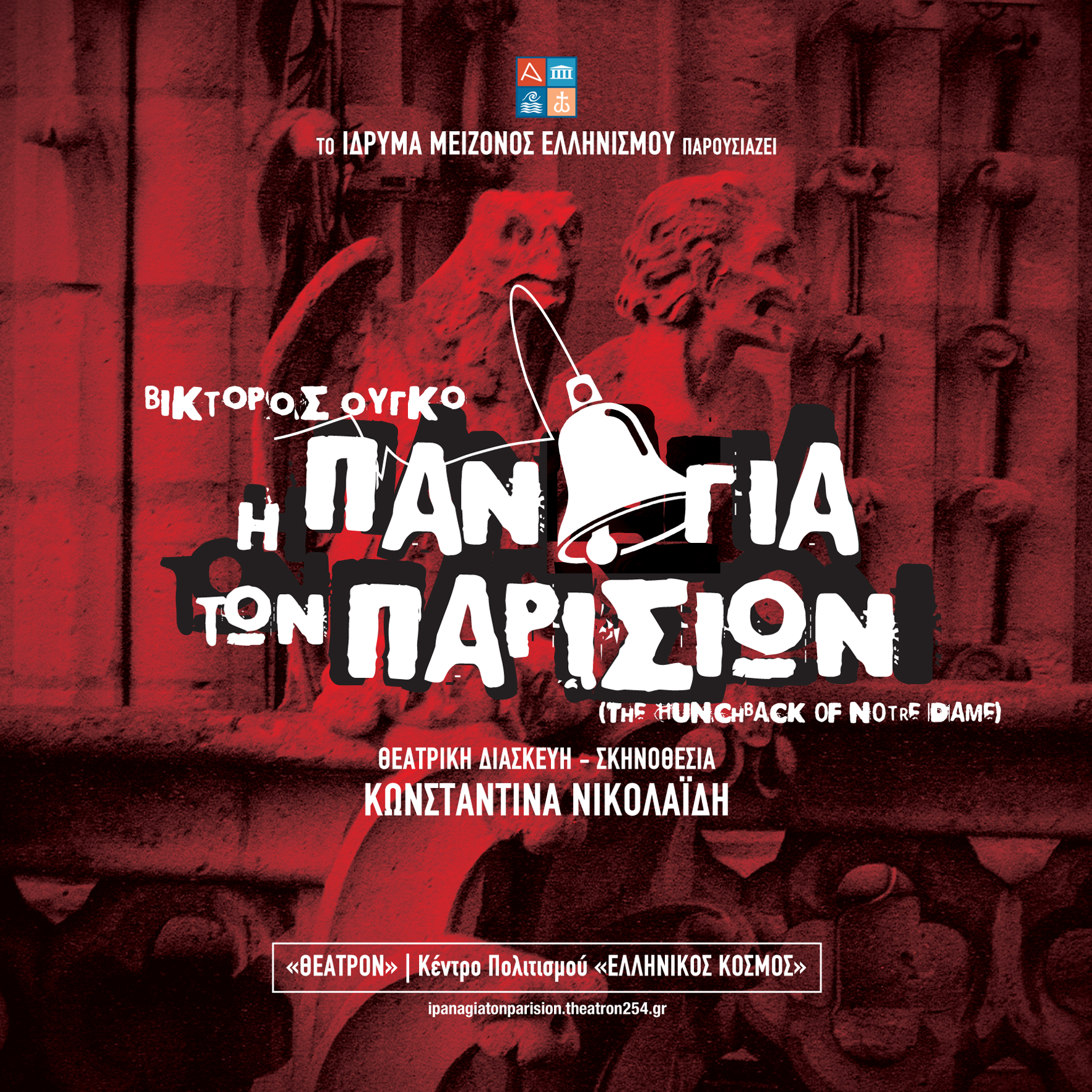 Το κορυφαίο έργο της ρομαντικής λογοτεχνίας του Βίκτορος Ουγκό, «Η Παναγία των Παρισίων», ζωντανεύει στο «Θέατρον» του Κέντρου Πολιτισμού «Ελληνικός Κόσμος», σε θεατρική διασκευή και σκηνοθεσία Κωνσταντίνας Νικολαΐδη μαζί με έναν θίασο 20 εξαιρετικών ηθοποιών