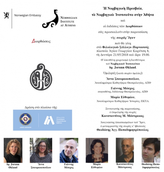 Η Νορβηγική Πρεσβείατο Νορβηγικό Ινστιτούτο στην Αθήνα και οι εκδόσεις των Διορθώσεων σας προσκαλούν στην παρουσίαση της σειράς Ίψεν που θα γίνει στο Φιλολογικό Σύλλογο Παρνασσός, πλατεία Αγίου Γεωργίου Καρύτση 8, τη Δευτέρα 21/05/2018 και ώρα 19.00.