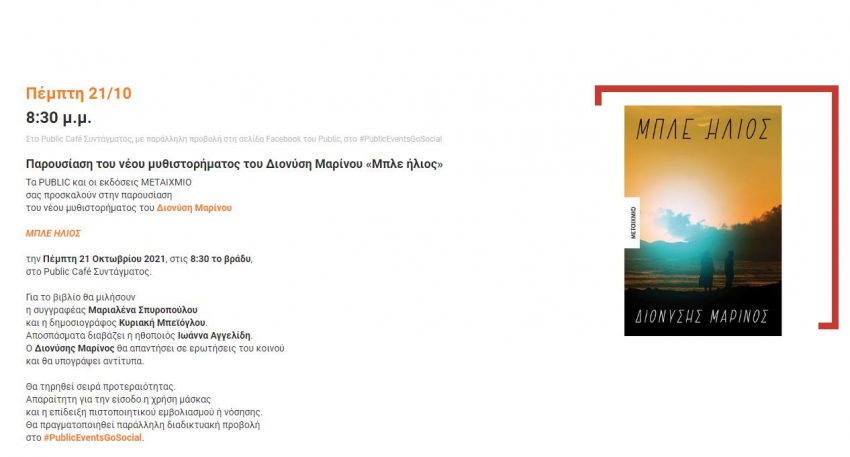 Η πρώτη παρουσίαση του νέου μυθιστορήματος «Μπλε Ήλιος» (εκδ. Μεταίχμιο) του Διονύση Μαρίνου έρχεται την Πέμπτη 21 Οκτωβρίου στο Public Συντάματος.