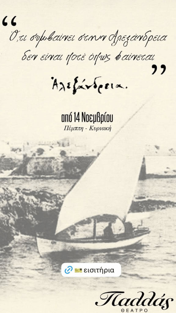 Στο Παλλάς, το κοινό θα ταξιδέψει στην Αλεξάνδρεια του Μεσοπολέμου· μια πόλη γεμάτη αντιθέσεις και ομορφιά, όπου συναντιούνται πολιτισμοί, έρωτες, γλώσσες και μουσικές. Η Αλεξάνδρεια γίνεται σχεδόν ένας ζωντανός χαρακτήρας με ψυχή — μιλάει για τον έρωτα, τις αλλαγές, τη ζωή την ίδια. Και το πιο όμορφο; Δεν μένει μόνο στην εποχή της, αλλά κουβαλάει κάτι διαχρονικό.